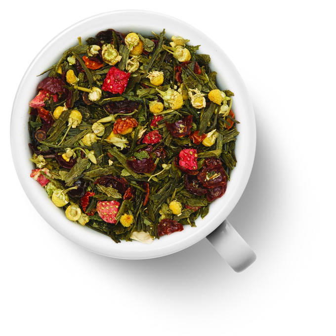 Зеленый чай,кусочки шиповника, цветы ромашки, листья крапивы, кусочки корицы и клубники. Ароматизирован натуральными маслами. Сорт высший.