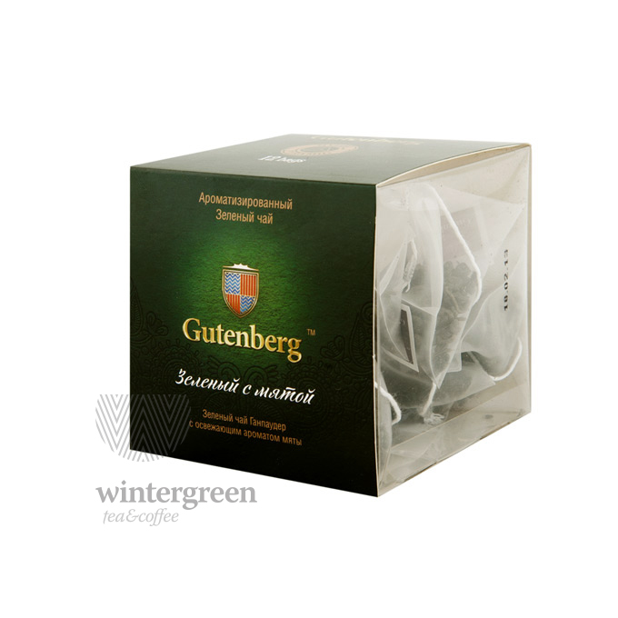 Зеленый чай ганпаудер, ароматизированный натуральными маслами мяты. Пластиковая коробка по 12 пирамидок.